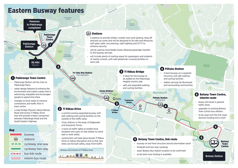 The Eastern Busway will connect Botany, Pakūranga, and neighbouring suburbs to the rail network in Panmure and its key features are described below.
